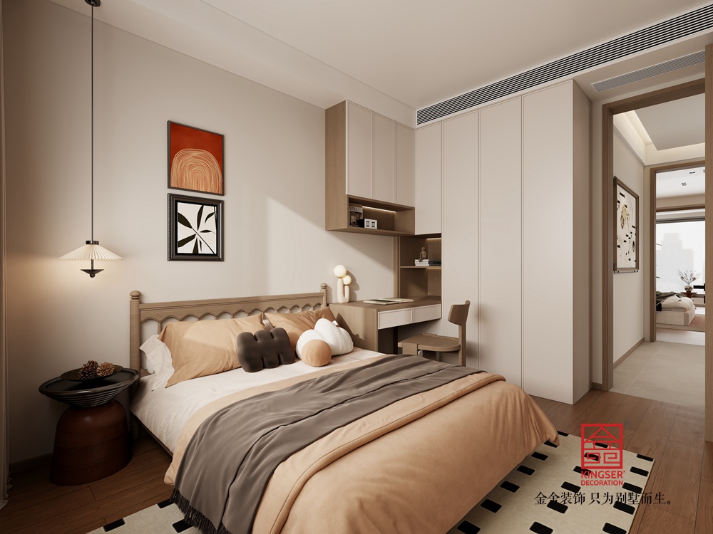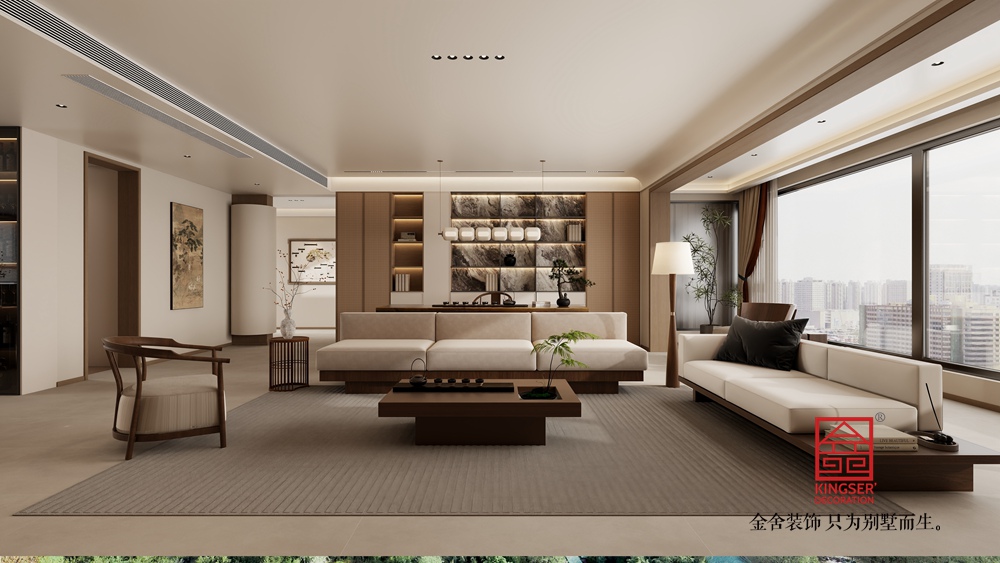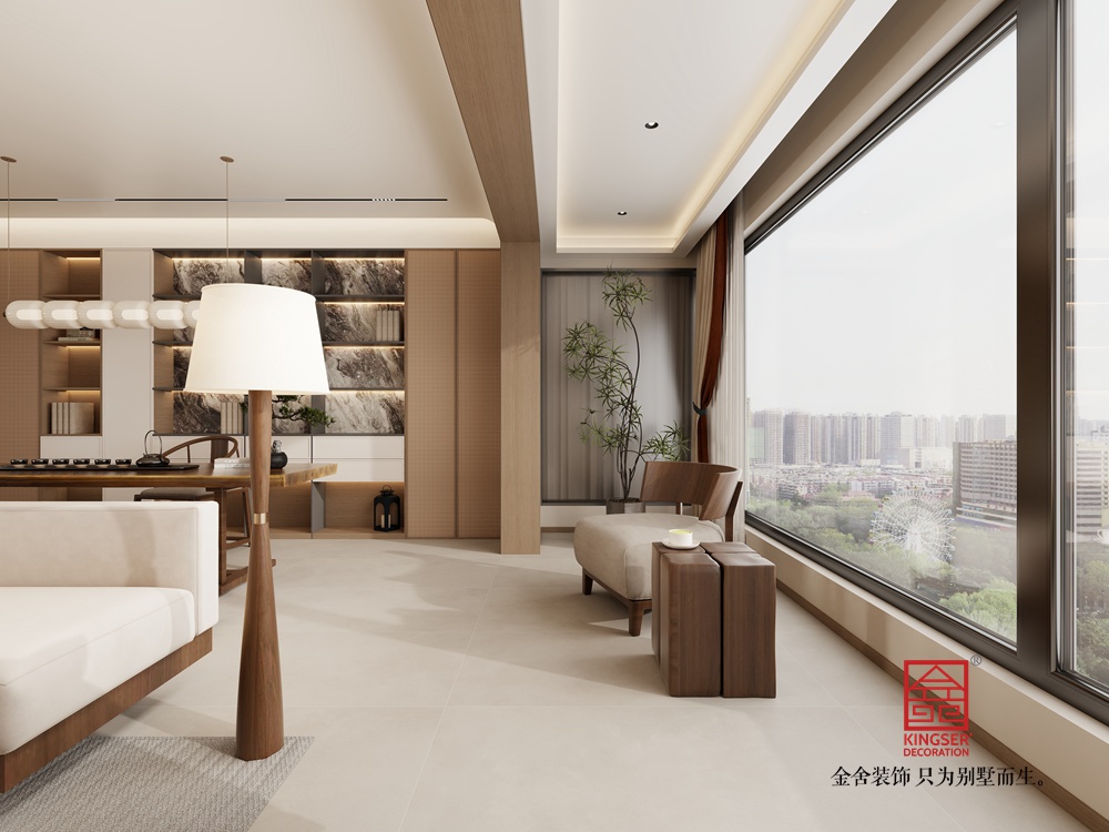 寬闊的落地窗引入充足自然光線,搭配雅致的窗簾,讓室內(nèi)外景致交融??臻g中點(diǎn)綴的綠植、中式擺件,以及墻上的簡約裝飾,都為空間增添了文化氣息與自然意趣,打造出一個兼具實(shí)用性與美學(xué)價值,能讓人在現(xiàn)代生活中感受東方美學(xué)底蘊(yùn)的愜意居所。