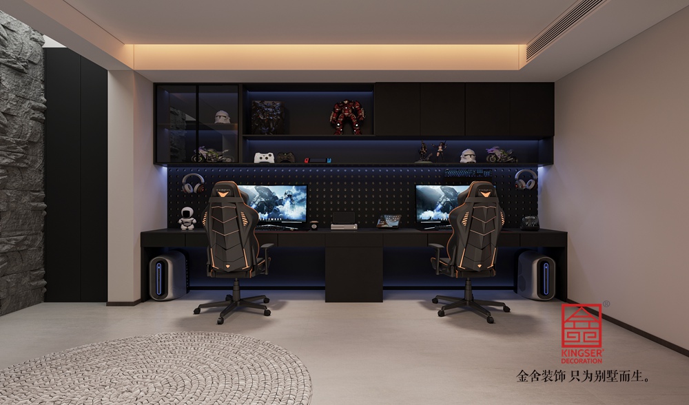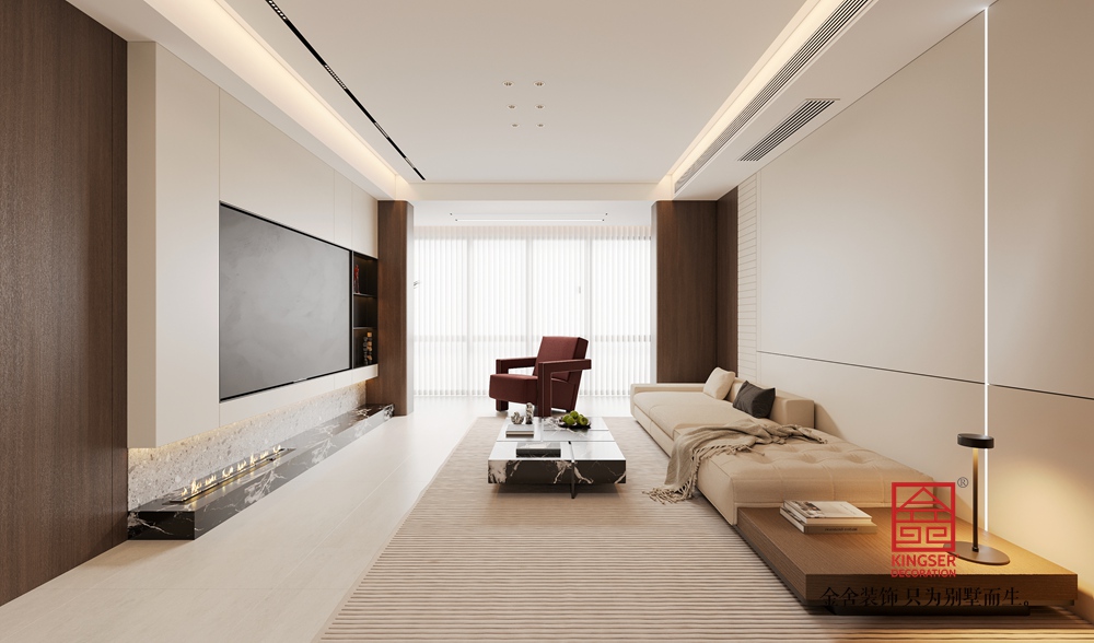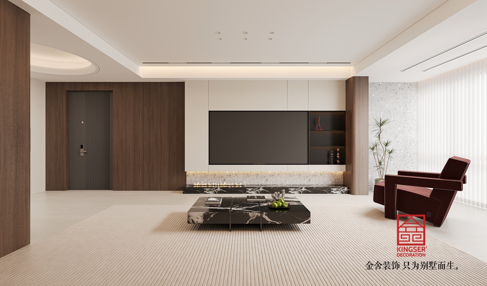 采用開(kāi)放式布局,將觀影、休憩功能有機(jī)整合。線性燈光設(shè)計(jì)強(qiáng)化了空間縱深感,隱藏式燈帶與點(diǎn)光源結(jié)合,營(yíng)造出柔和且富有層次的照明效果;大面積落地窗搭配百葉簾,保證采光的同時(shí)兼顧隱私,讓空間在通透與雅致間找到平衡。